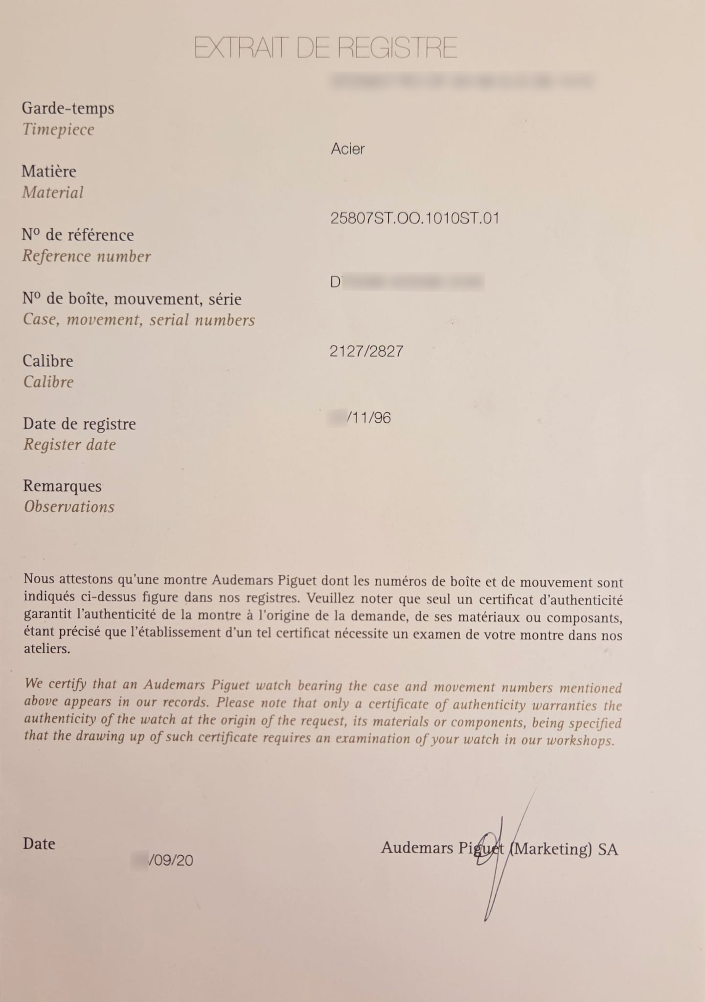Contenu : Montre, écrin et extrait de registre
